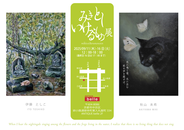 題字の『みきとしいけるもの展』は古今和歌集の冒頭の歌から借りた、
